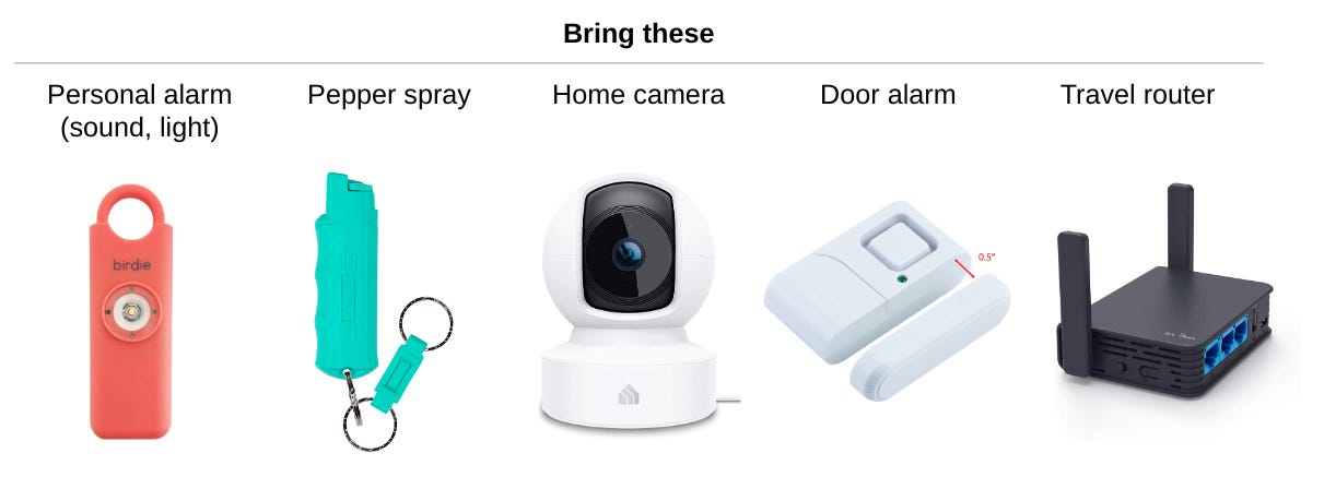 Consider bringing a travel router, so that you have one more layer of defense from compromised networks. You connect your router to the Airbnb/hotel/event space internet, and your devices connect to the travel router. You can turn on protection for DNS rebinding attacks and DNS encryption, which will protect you from malicious websites looking to compromise devices in a specific location