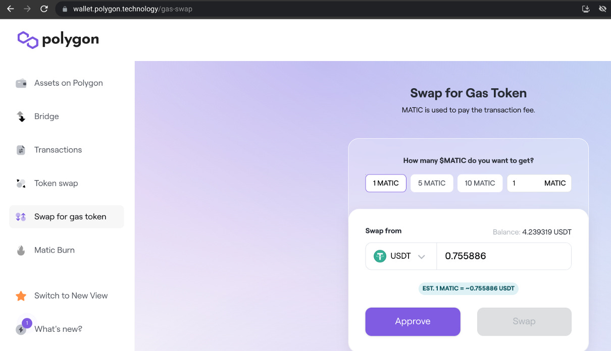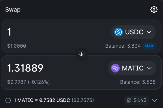 This is where Polygon allows me to exchange my Polygon USDT for some Polygon MATIC, without first requiring me to have MATIC in my wallet (I laugh again). At last, finally, I got myself some MATIC on Polygon. Sweet relief.